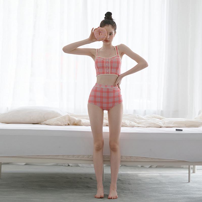 2025 Korean Style Plaid High Waist Slimming Bikini for Girls