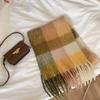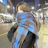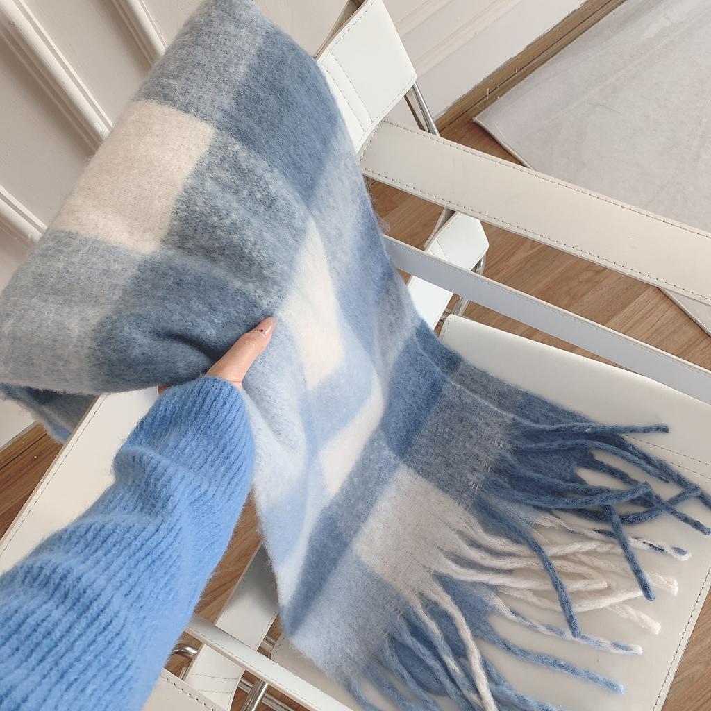 Herbst Winter Damen Verdickter Übergroßer Blauer Karoschal mit Fransen Fleece-ähnlicher Kaschmir Warmer Nackenwärmer Studenten Großer Schal