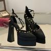 Fashion Laufsteg Stil Mode Nieten Satin Mary Janes Damen Pumps Sexy 15CM Ultra Hohe Absätze Plateau Wedges Frühling Sommer Partyschuhe
