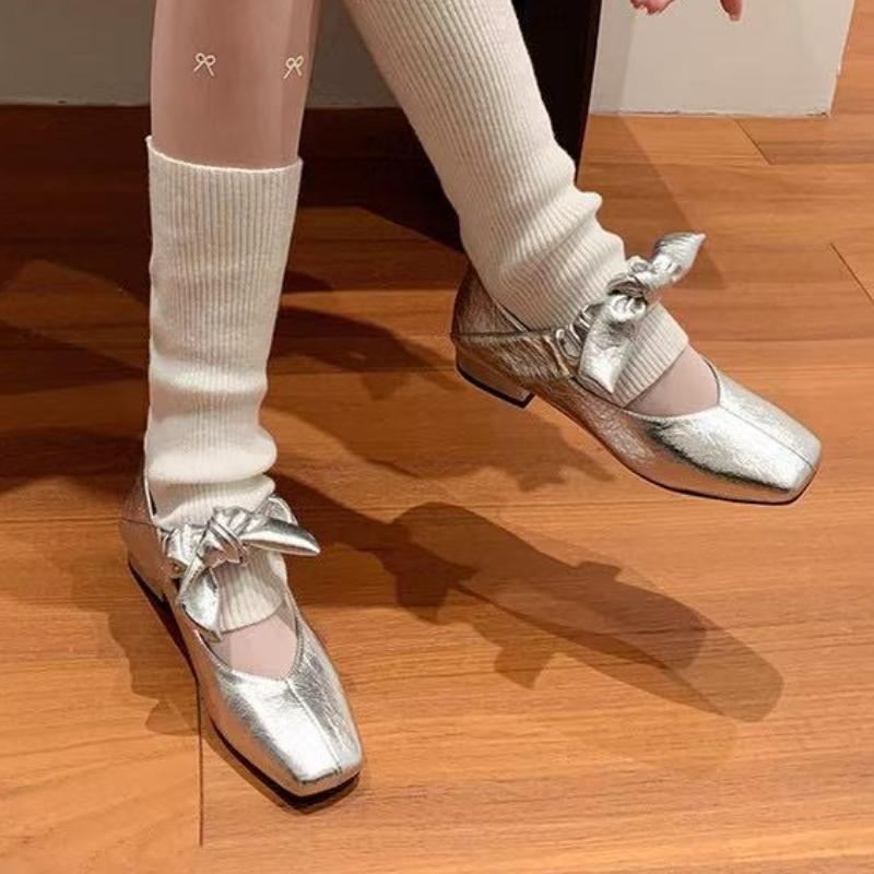 Mode Elegante Damen Schleife Quadratische Zehenpumps Bequeme Niedrige Absätze Süße Damenschuhe Rindspaltleder Flache Schuhe Slipper Loafer