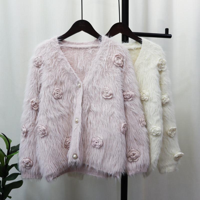 Dreidimensionale Blume Imitation Nerz Samt Gestrickte Strickjacke Damen Herbst Neu Kleiner Duftendes Temperament Locker Weich Wachsig Pulloverjacke