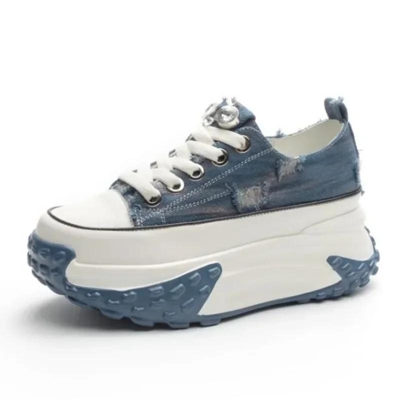 Mode 6CM Denim Echtleder Plateau Keilabsatz Schuhe Klobiger Sneaker Lässig Bequem High Brand Strass Frühling Bling Herbstschuhe