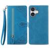 Für iPhone 16 Reißverschluss-Brieftasche Hülle mit Riemen Blumenprägung PU-Leder Handyhülle