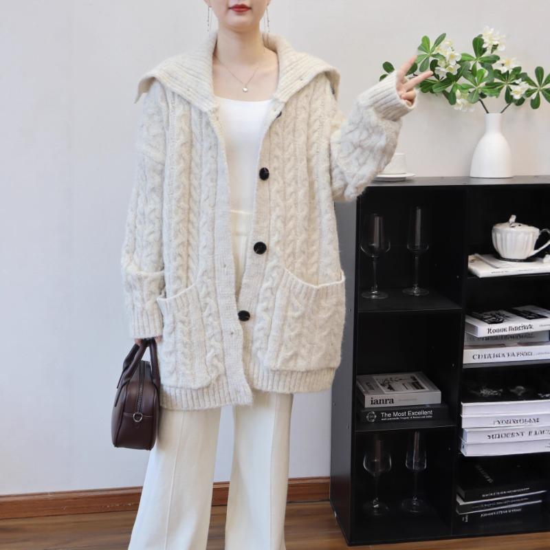 Autumn and winter new medium and long lapel loose twist knitted cardigan lazy wind sweater jacket women
