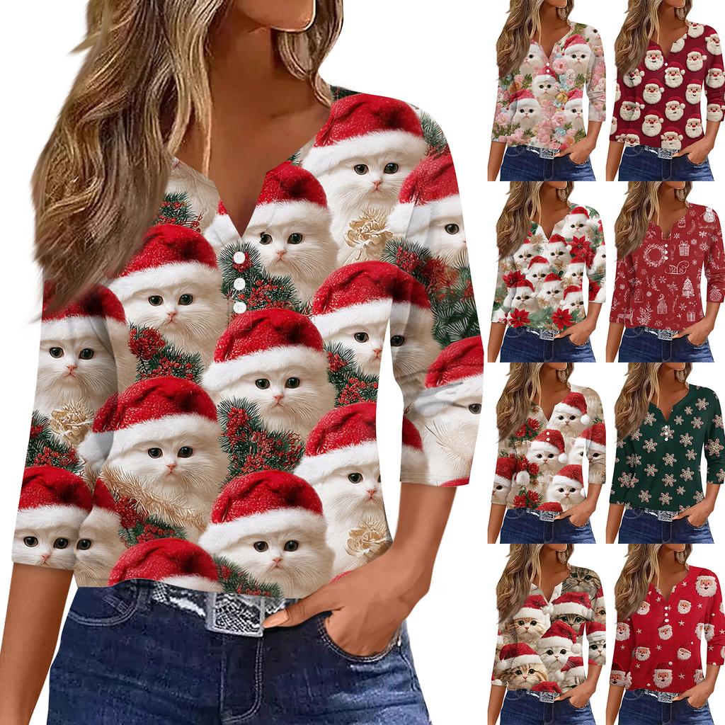 Damenmode Lässig Halloween Bedruckt V-Ausschnitt Kurzarm Zierknopf Dreiviertelarm T-Shirt Top