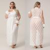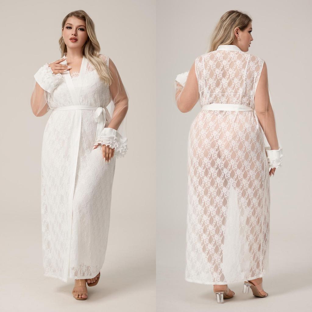 Gönnen Sie sich luxuriösen Komfort mit diesem Damen-Eisseiden-Spitzen-langen Bademantel und Nachthemd in Übergröße. Dieses exquisite Set aus hochwertiger Seide fällt wunderschön und bietet ein weiches und glattes Gefühl auf der Haut.. Der Morgenmantel ist mit zarten Spitzendetails versehen, die eine elegante und anspruchsvolle Note verleihen.. Dieses Set ist perfekt zum Entspannen oder als Nachtwäsche und vereint Stil und Komfort nahtlos, was es zu einer entzückenden Ergänzung Ihrer Garderobe macht.