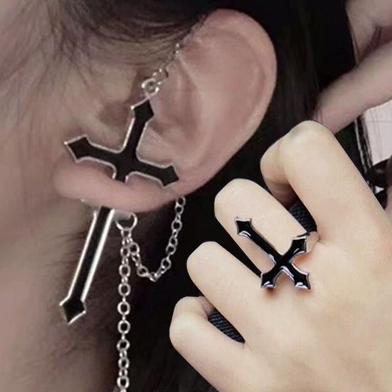 Vintage Schwarze Große Kreuz Quasten Ohrringe Für Frauen Party Zirkon Punk Trendy Gothic Metall Ring Ohrringe Geschenke