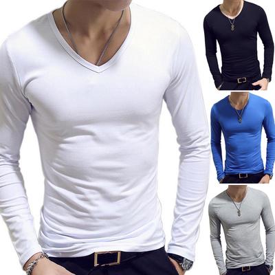 Langärmeliges Slim-Fit Herren-T-Shirt Schrumpffest Einfarbig V-Ausschnitt Unterhemd Pullover-Top