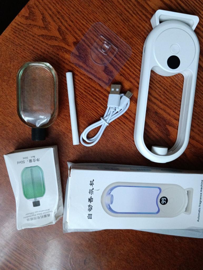 Der Diffusor hat mir gefallen. Im Set sind eine Anleitung, eine aromatisierte Flüssigkeit, ein selbstklebender Haken und ein Kabel enthalten..