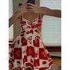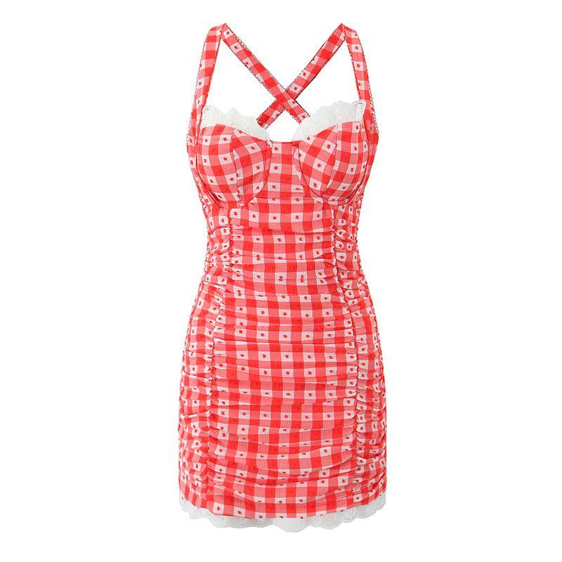 For Love Sweet Oxygen Strawberry French style Retro Plaid Sexy Lace Cross Sling Vacation Dress