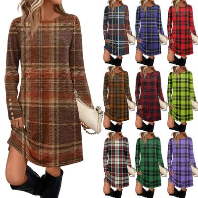 Herbst Frühling Kleid Rundhals A-Linie Taschen Locker Großer Saum Lange Ärmel Minikleid Reine Farbe Casual Dating Shopping Kurzes Kleid