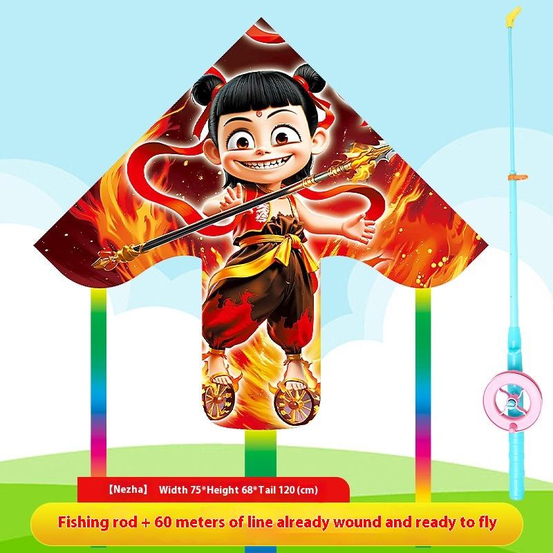 1 Set Cartoon Nezha Foldable Mini Plastic Kites Hand Brake Fishing Rod Children Kite Toy Kids Fun Outdoor Toys