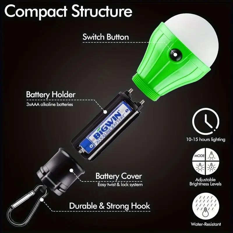 Portable LED Tent Light – 3 Lighting Modes, Carabiner Hook, Battery-Powered for Outdoor Camping