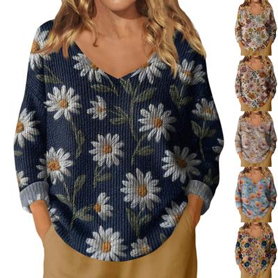 Damen Lässige Mode Elegant Floral Gestrickter V-Ausschnitt Pullover
