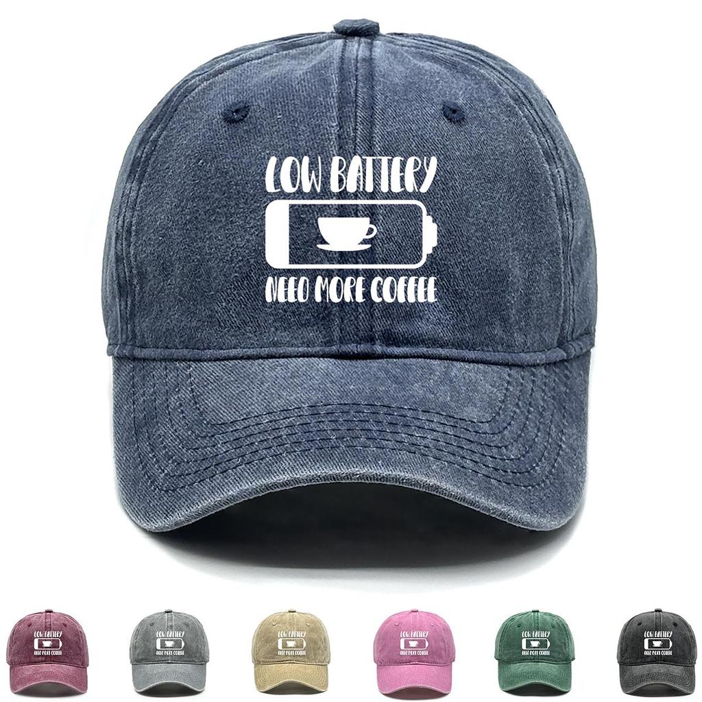 LOW BATTERY NEED MORE COFFEE" Print Adjustable Sun Hat, Mesh Hat Washed Curved Brim Fit Sunshade Snapback Baseball Hat