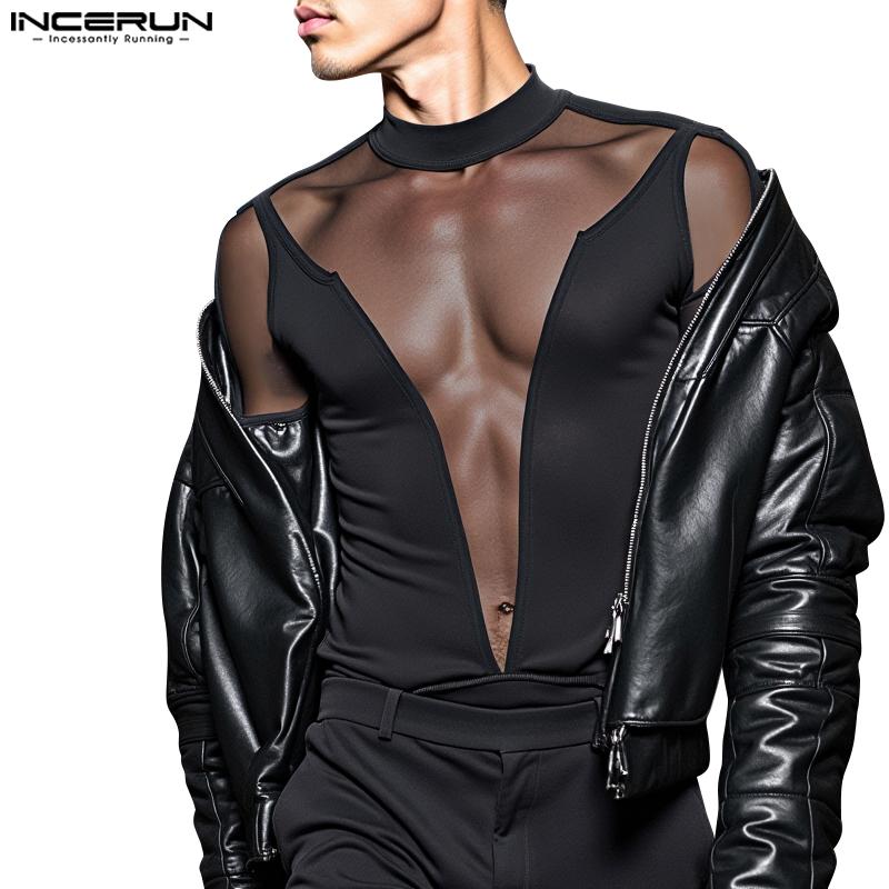INCERUN Men Long Sleeve See Through Mesh Sheer Party T-shirts Tops