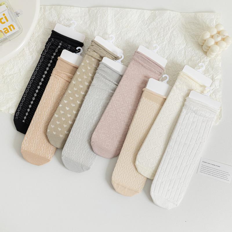 5/10 Pairs Comfortable Casual Spring Summer Solid Color Rolled Hem Pile Socks for Women Cute Mid Calf Socks Mesh Breathable Cotton Socks