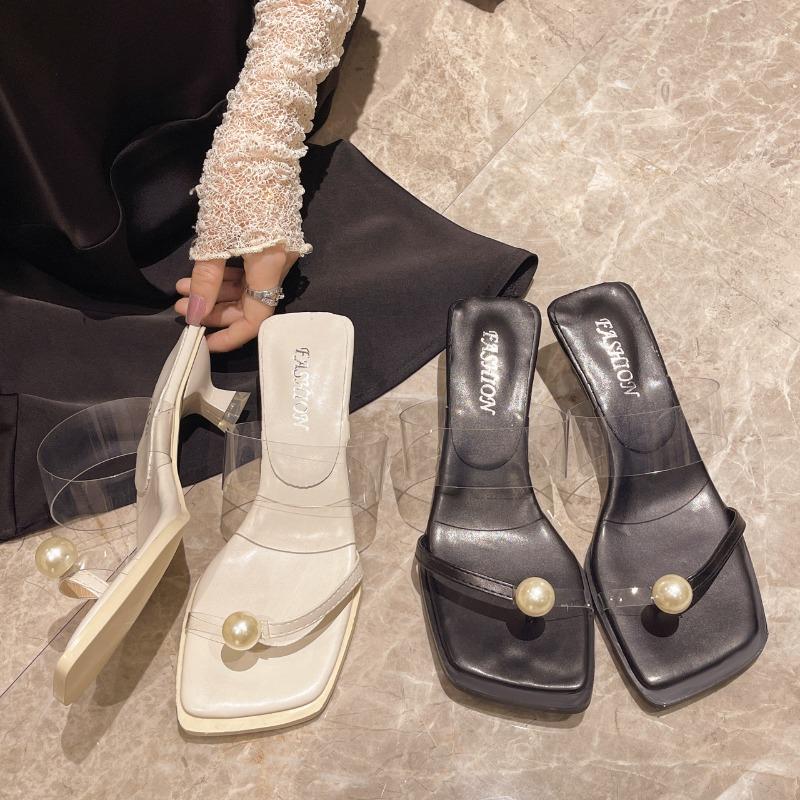 Temperament mit niedrigen Absätzen, kleine Füße, coole Pantoletten, Feenschuhe, neue Frühlings- und Sommer-Perlensandalen mit flachem Boden