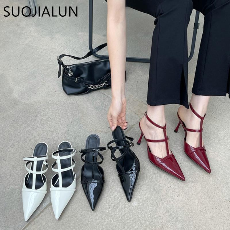 Mode SUOJIALUN 2025 Frühling Neue Spitzschuh Damen Sandale Mode Knöchelriemen Dünner Hoher Absatz Damen Elegante Pumps Kleid Slingback Schuhe