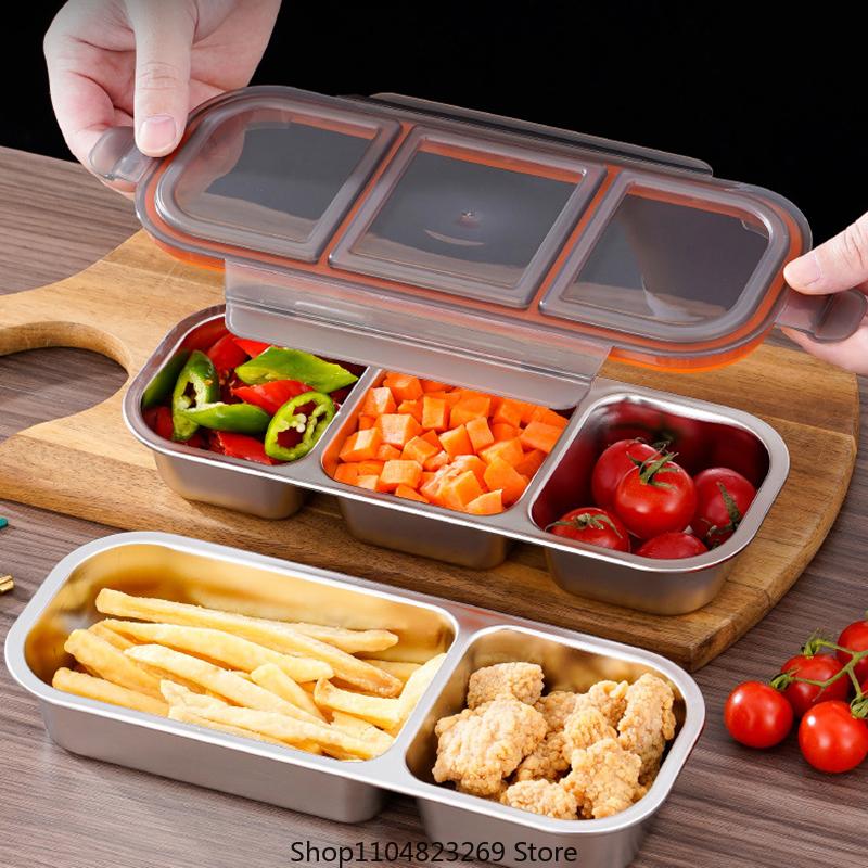 Wiederverwendbare Gewürzbox mit Deckel, Edelstahl-Snackbehälter, 3-fach unterteilte Saucenbecher, unterteilter Lebensmittelaufbewahrungsbehälter