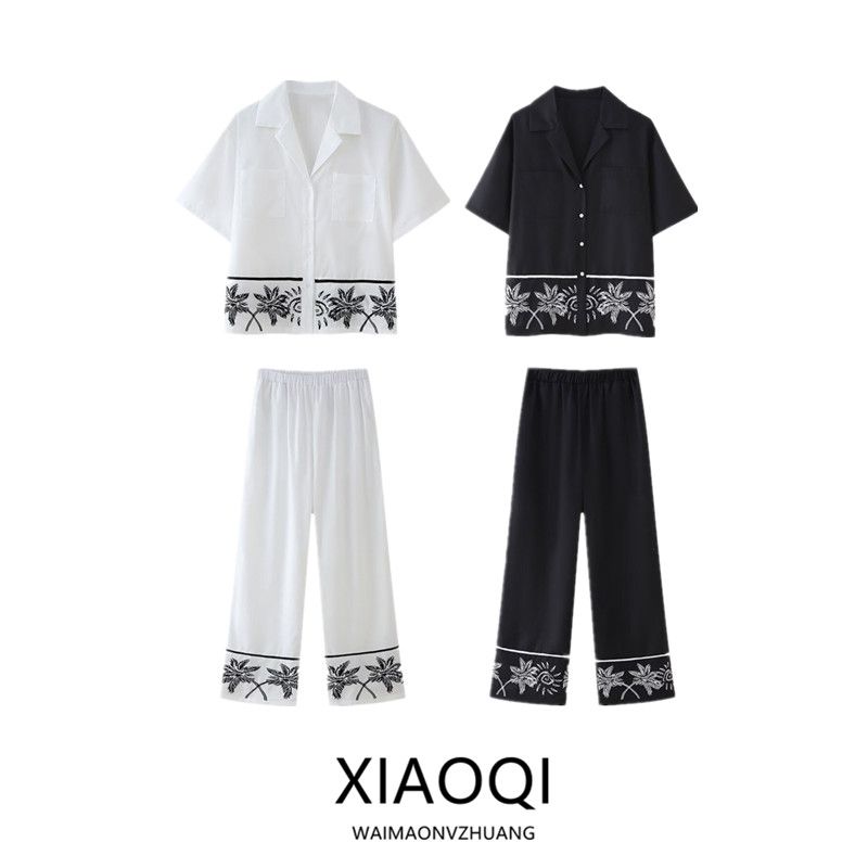 Western Style 2024 Summer New Women clothes Design Slimming Versatile Embroidered Short sleeve Shirts Mid-Waist Trousers