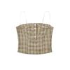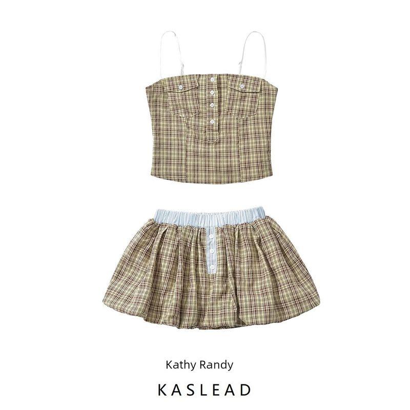 Kaslead New Arrival Women's Clothing Fashion Style Fashion Simple Plaid Camisole Bubble Short Culottes Suit