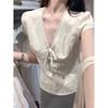 Kumikumi Design Sense Lace Short sleeve Shirts Women clothes Summer French style Bow Lace-up V-neck Top