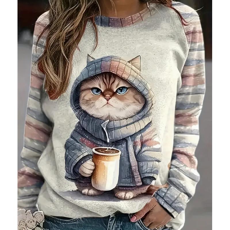 2025 Herbst & Winter Damen Neues Lässiges Rundhals Langarm Oberteil 3D Katzenmuster