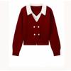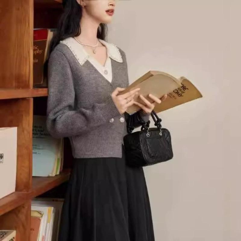 Gray fake two-piece sweater women's autumn and winter new small beaded lapel long-sleeved knitted sweater top