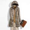 Diese stilvolle Damen-Daunenjacke in mittlerer Länge ist die perfekte Ergänzung für Ihre Herbst- und Wintergarderobe. Entworfen für Wärme und Komfort, verfügt es über eine leichte Entendaunenfüllung und eine mittlere Dicke, um Sie an kühlen Tagen warm zu halten.. Die Jacke ist aus strapazierfähigem Nylon gefertigt, was sowohl Langlebigkeit als auch ein elegantes Aussehen gewährleistet.. Mit einer abnehmbaren Kapuze können Sie sich leicht an wechselnde Wetterbedingungen anpassen.. Es zeichnet sich durch eine schmeichelhafte schlanke Passform, lange Ärmel aus und ist speziell für Übergrößen gefertigt, was sowohl Funktionalität als auch Mode für die kältere Jahreszeit bietet.