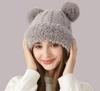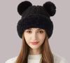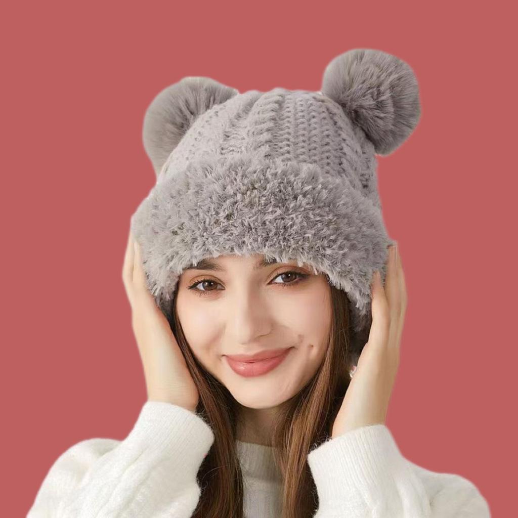 Niedliche Damen Wintermütze mit Bommel aus Wolle, Plüschrand und Ohrenschutz