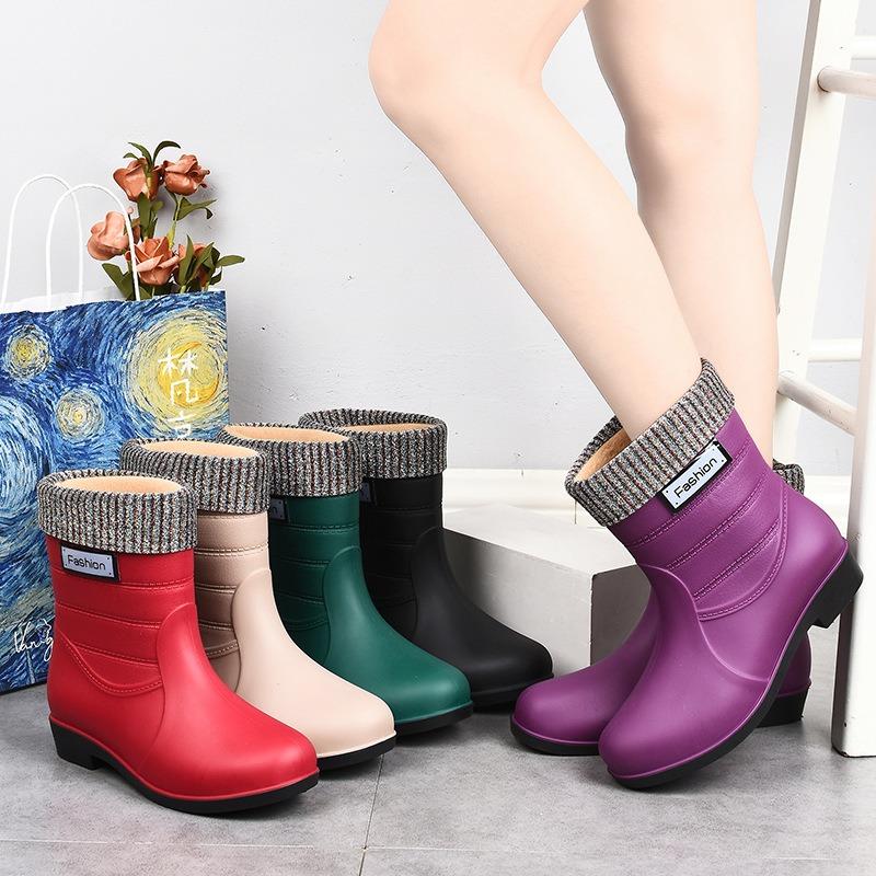 New fashion rain shoes women's medium tube warm rain boots non-slip water shoes work rubber shoes adult cotton water boots overshoes