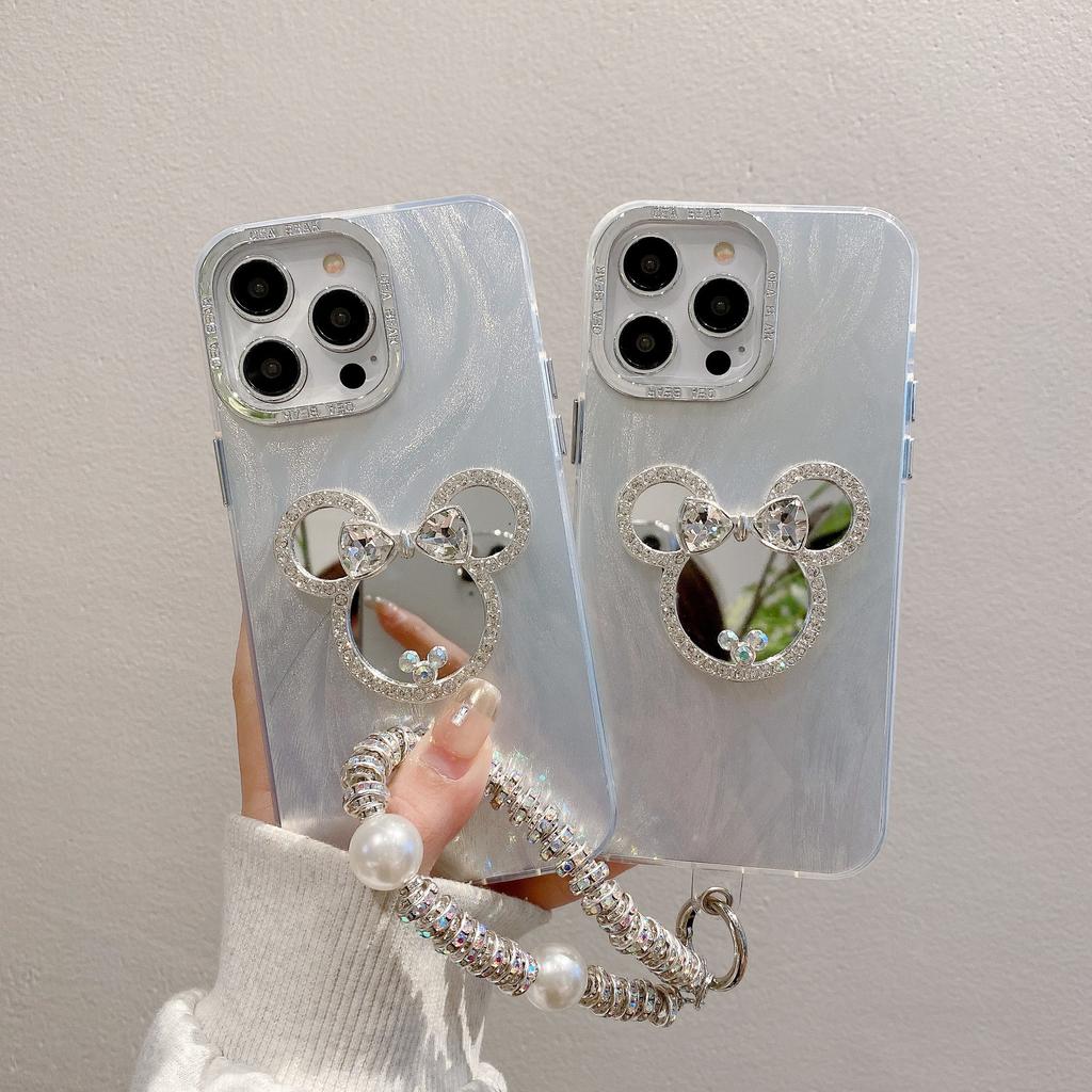 Galvanisierter Rahmen Federgarn Geeignet für Apple 15pro Mickey Spiegel mit Armband IPhone16promax Hart Handyhülle