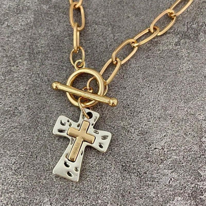 1PC Retro Boho Cross Pendant Necklace Chunky Statement Pendant Necklace for Women Unique Silvery Golden Chain Necklace Religious Christian Cross