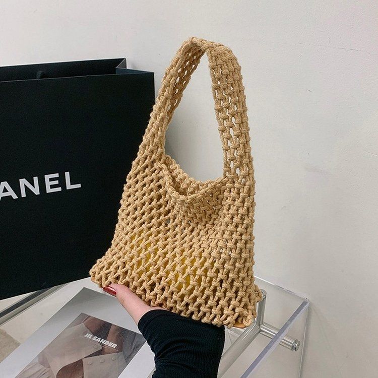 Ausgehöhlte Netzbeutel Handtasche Handgewebte Baumwollseil Tasche Handgelenktasche Strandurlaub Eimertasche