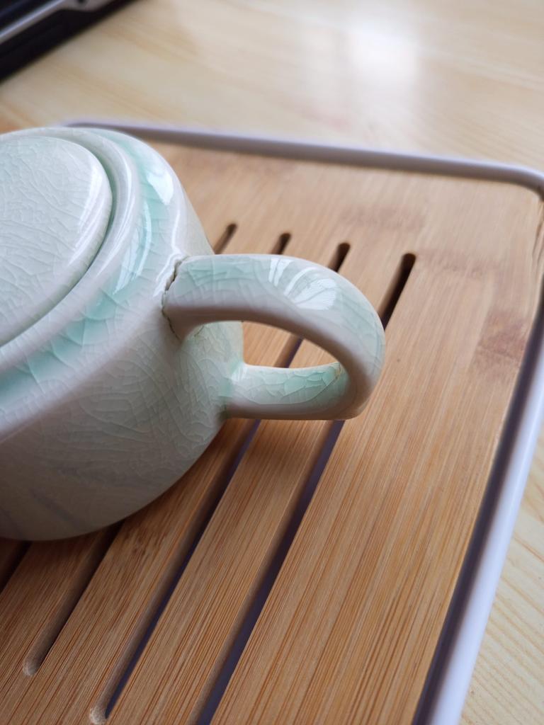 Niedliches, gutes Teekannenset, leider ist der Henkel der Teekanne und der Rand der Bambusschale gesprungen. Das Muster auf dem Glas ist überall fein rissig, vielleicht ist das so gewollt, aber das war leider auf den Bildern nicht zu sehen.