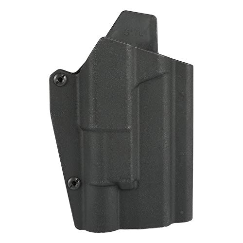 This holster accommodates a G17/G19 with an attached SF X300 flashlight. The hex screw on the trigger adjusts the tension, allowing for different storage compartments. Use the short screw and sleeve when storing a handgun alone, or the included long screw and sleeve when storing a light.