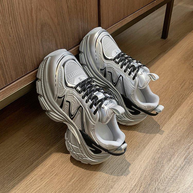 Plateau-Dad-Schuhe aus Leder Damen Herbst 2025 neue atmungsaktive silberne Freizeitschuhe vielseitige herbstliche Schuhe mit Absatz