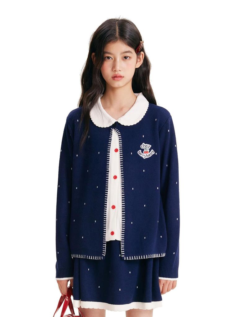 Barry Banny Strick Lang Rund Marineblau Gepunktet Bestickt Faux Niedlich und Stilvoll Größe 160 Kinder Strickjacke, Mantel, Mädchenpullover, Ärmel, Kragen, Punkte, Schicht,