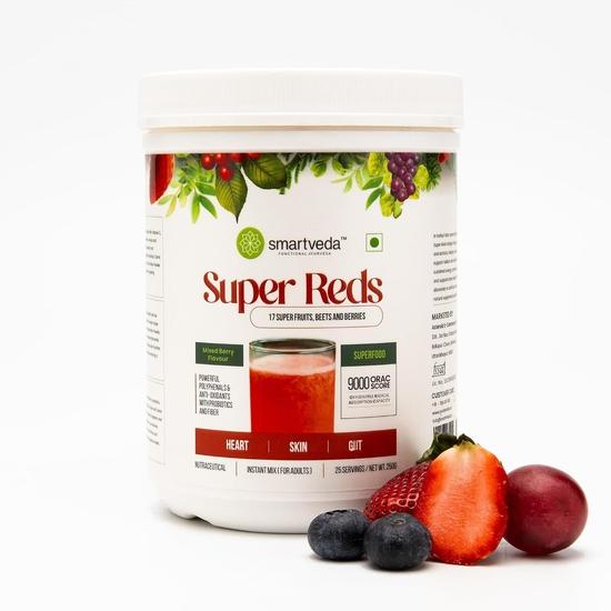 Smartveda Super Reds Pulver ist eine einzigartige Superfood-Mischung, die mit der Güte von 17+ Frucht-, Beeren- und Rübensaft-Extrakten hergestellt wurde und dazu bestimmt ist, Ihrer täglichen Wellness-Routine natürliche Vitalität zu verleihen.. Diese Formulierung ist reich an Polyphenolen und pflanzlichen Antioxidantien und unterstützt die allgemeine Energie, das Verdauungsgleichgewicht und die Hautgesundheit.. Die natürliche Kombination aus Beeren und Rote Bete bietet eine erfrischende Nährstoffquelle, die helfen kann, einen gesunden Stoffwechsel, das Wohlbefinden des Darms und natürliche Ausstrahlung von innen zu fördern.. Angereichert mit Stevia, ist es eine Option ohne Zuckerzusatz, was es für diejenigen geeignet macht, die nach einer gesünderen Lebensweise suchen.. Seine leuchtend rote Mischung ergibt eine köstliche Ergänzung zu Smoothies, Säften oder einfach mit Wasser gemischt für ein erfrischendes, nahrhaftes Getränk.. Mit seinem natürlichen Geschmack und seinem nährstoffreichen Profil bietet dieses Pulver eine bequeme Möglichkeit, essentielle Phytonährstoffe und Antioxidantien in Ihre Ernährung einzubauen.. Smartveda Super Reds Pulver wird in Indien mit Sorgfalt hergestellt, wodurch Qualität und Reinheit in jeder Portion gewährleistet werden.. Ideal für Personen, die einen täglichen Nährstoffschub suchen, macht es Wellness sowohl angenehm als auch effektiv.