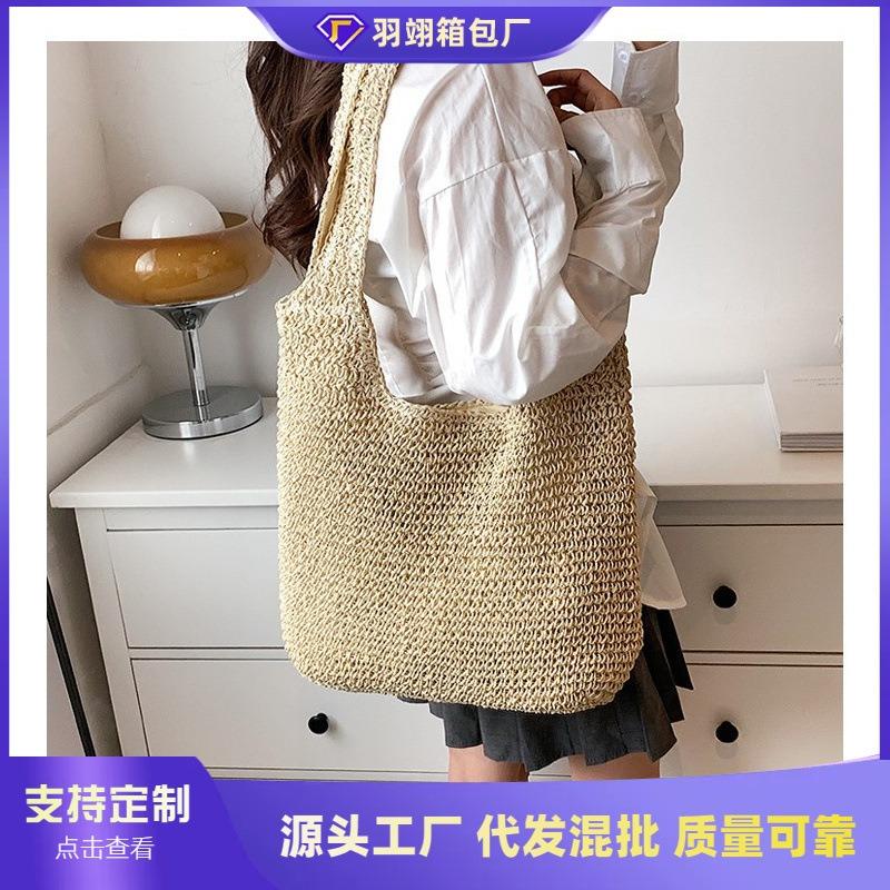 Strandtasche aus Stroh, Frühling, schlicht, gehäkelt, hohl, für den Weg zur Arbeit, große Kapazität, Schulter-Umhängetasche