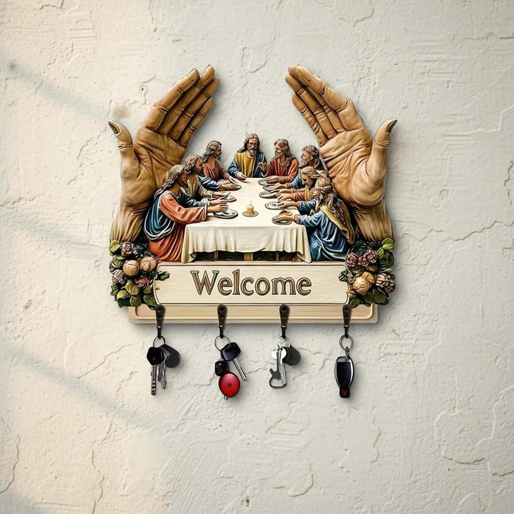 【Exquisiter 2D Flacher Jesus & Jünger Wandkunst Schlüsselanhänger】Werten Sie Ihren Raum mit diesem aufwendig gestalteten 2D Flachen Jesus und Jünger Wandkunst Schlüsselanhänger auf, der heilige Kunstfertigkeit mit Praktikabilität verbindet. Perfekt für rustikale Bauernhausdeko, dient es auch als funktioneller Schlüsselorganisator und verleiht Eingangsbereichen, Fluren oder Wohnbereichen spirituelle Wärme.