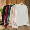 Damenmode Retro Samt Literarische Stickerei Stehkragen Langarm T-Shirt Top