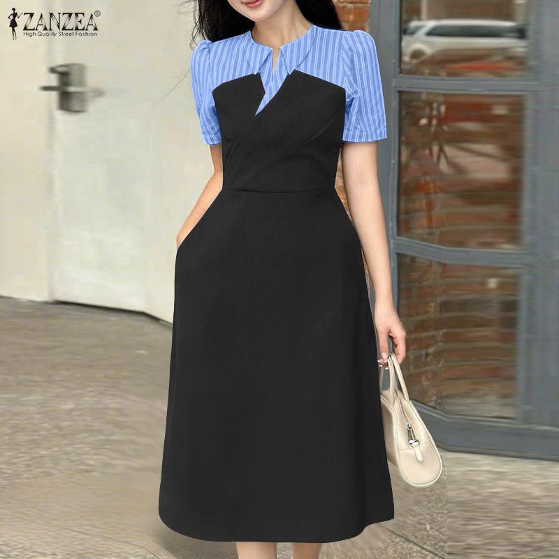 ZANZEA Women Stripe Patchwork Casual Turn Down Collar Summer Short Sleeve Dress