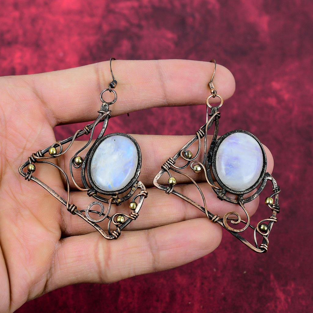Regenbogenmondstein Ohrring Kupferdraht Gewickelte Ohrringe Handgemachter Schmuck Natürlicher Edelstein Ohrring Schöner Kupferschmuck Jahrestagsgeschenke