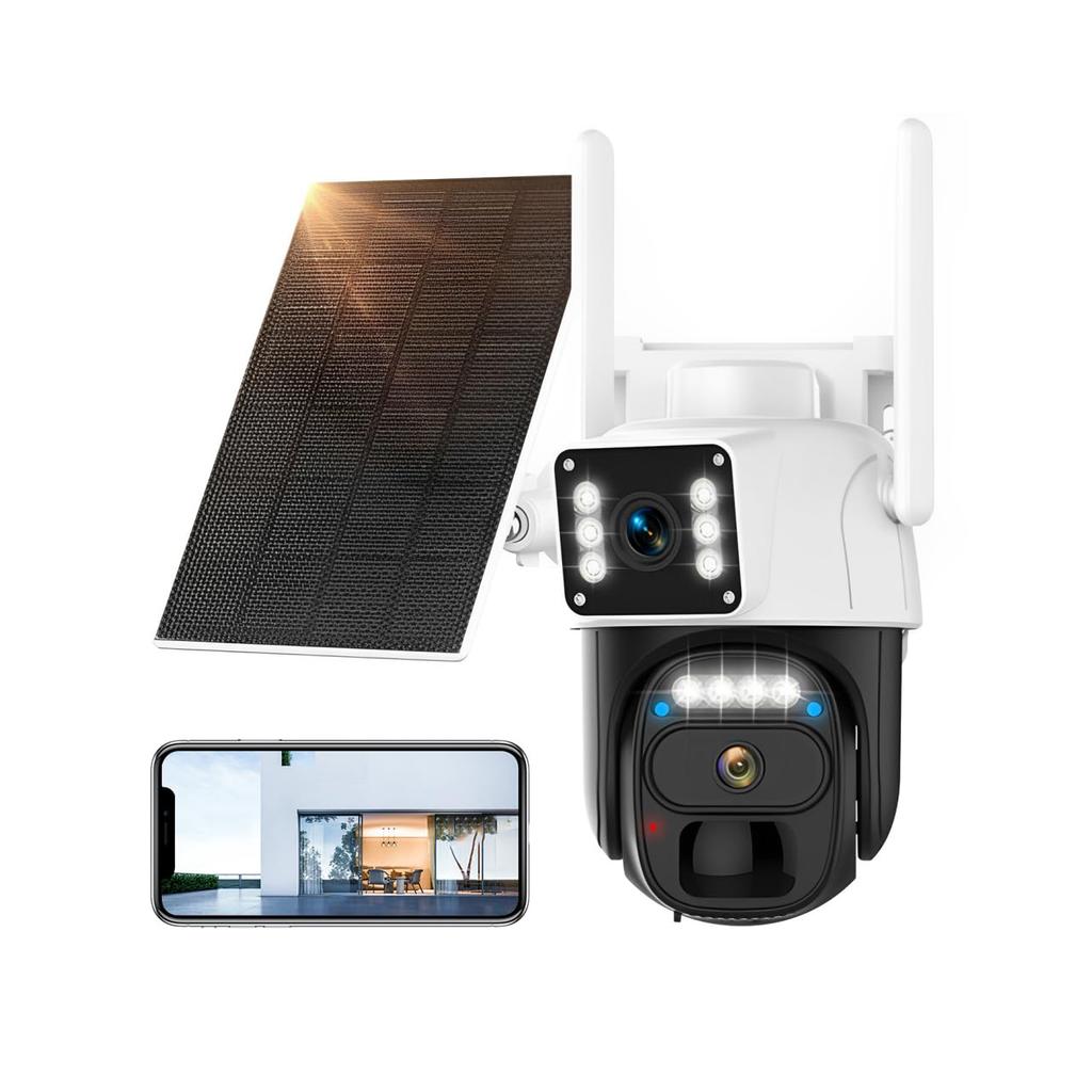 [Nachtsicht & Dual-Objektiv] Zusätzlich zu 3MP Full HD Auflösung ist es mit 10 weißen/Infrarot-LEDs ausgestattet. Es erreicht eine Nachtsichtweite von bis zu 50 m und schaltet je nach Situation automatisch zwischen Infrarotmodus und Farb-Nachtsichtmodus um.. Ausgestattet mit hochpräzisen Doppellinsen können Sie zwei verschiedene Bereiche gleichzeitig mit einem Smartphone betrachten, sodass Sie keine einzige Ecke Ihres Gartens verpassen.