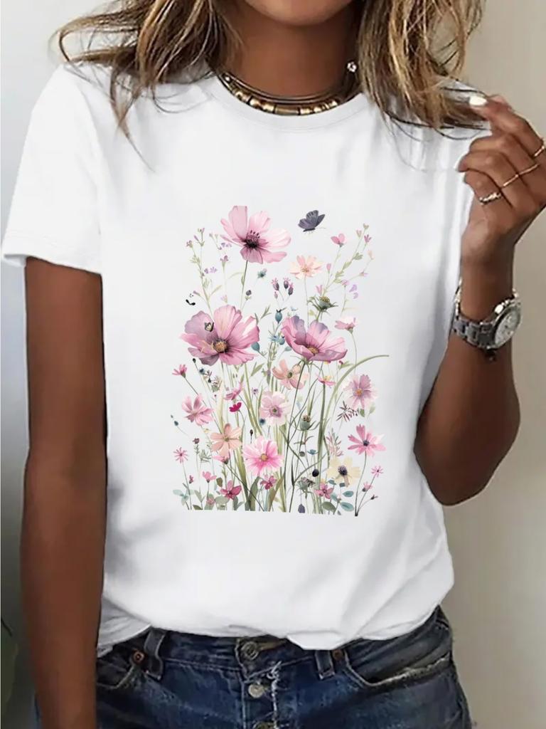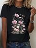 Women's Casual Loose Fit Short Sleeve T-Shirt Bright Pink Red Blue Floral Print on Black Ladies Tshirts Geometric Pattern Shirt