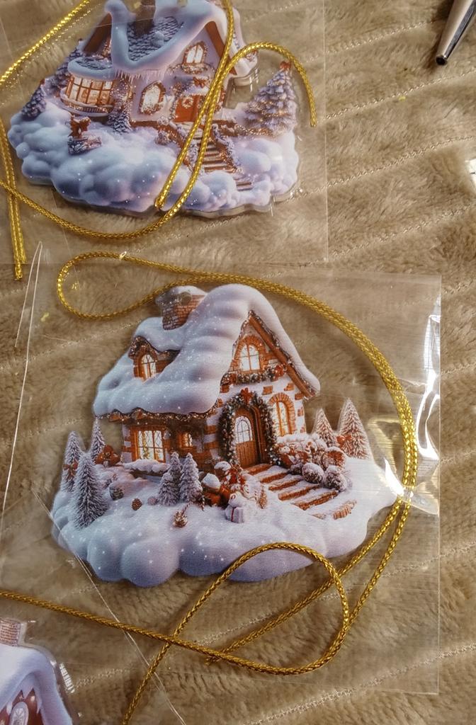 Schnee Dorf Haus Ornament Rustikale Blockhütte Hängeornament 2D Acryl Hütte mit Schneeszene für Winterwunderland Weihnachtsbaumdeko