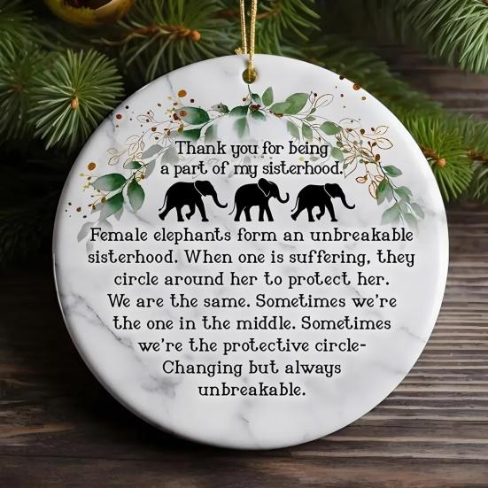 Feiern Sie die Bande der Freundschaft mit unseren Elefantenornamenten. Dieses einzigartige Stück symbolisiert Stärke und Ermutigung und ist somit ein perfektes Geschenk für deine beste Freundin.. Der Schmuck trägt eine herzerwärmende Botschaft: "Danke, dass du Teil meiner Schwesternschaft bist", und betont die lebenslange Schwesternschaft zwischen weiblichen Elefantenfreundinnen..
