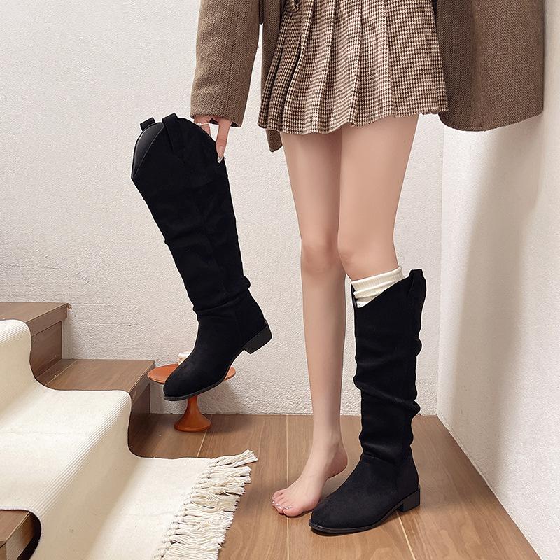 Herbst und Winter 2025 Retro Matte Plissierte Stiefel mit Raffung Damen Schuhe Maillard Braun Matt V-Ausschnitt Weitschaftstiefel